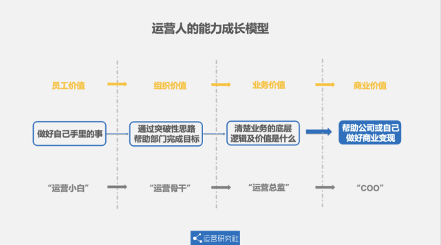 所以,在我看来,运营的成长基本都有这么几个阶段,或者说在你的职业生涯里,需要依次实现这几个价值:第一阶段,也就是通常所说的小白阶段,这一阶段主要实现的是「员工价值」,也就是你要理解这个岗位的要求,并且努力实现它。