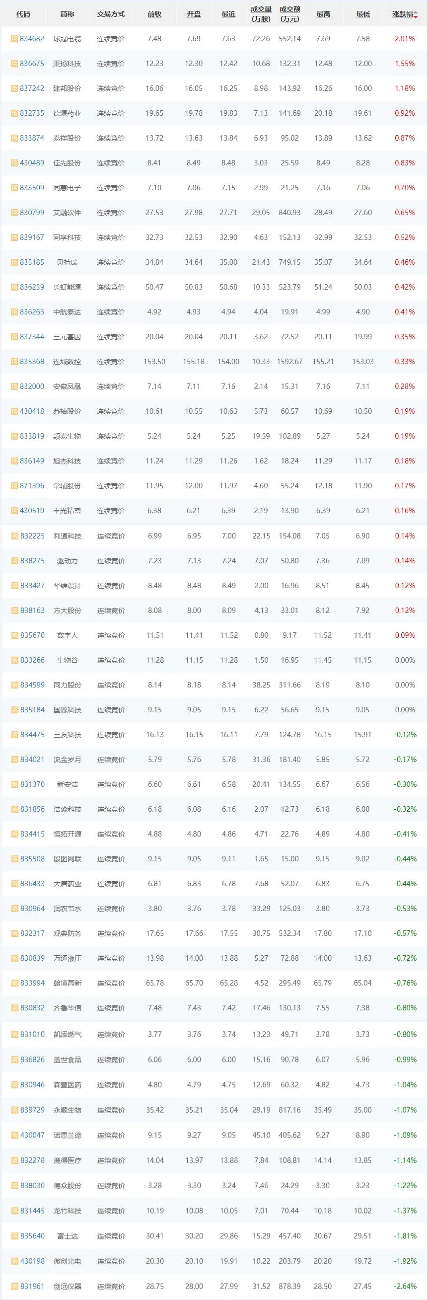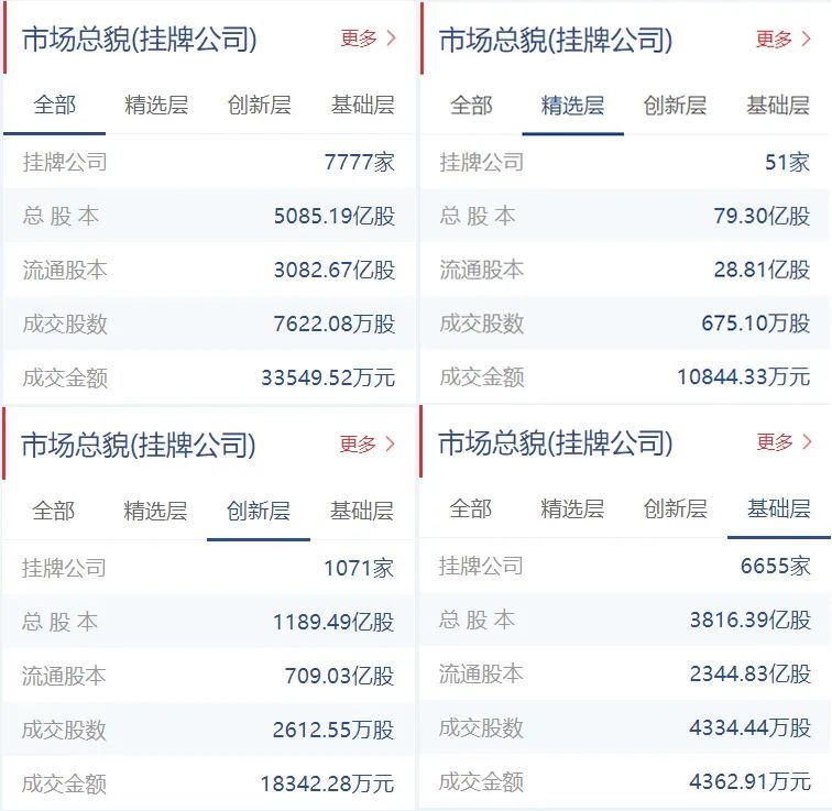 截至4月1日收盘,今日成交金额为3.35亿元,精选层成交金额为1.08亿元,创新层成交金额为1.83亿元,基础层成交金额为0.44亿元;今日成交股数为7622.08万股,精选层成交股数为675.10万股,创新层成交股数为2612.55万股,基础层成交股数为4334.44万股。
