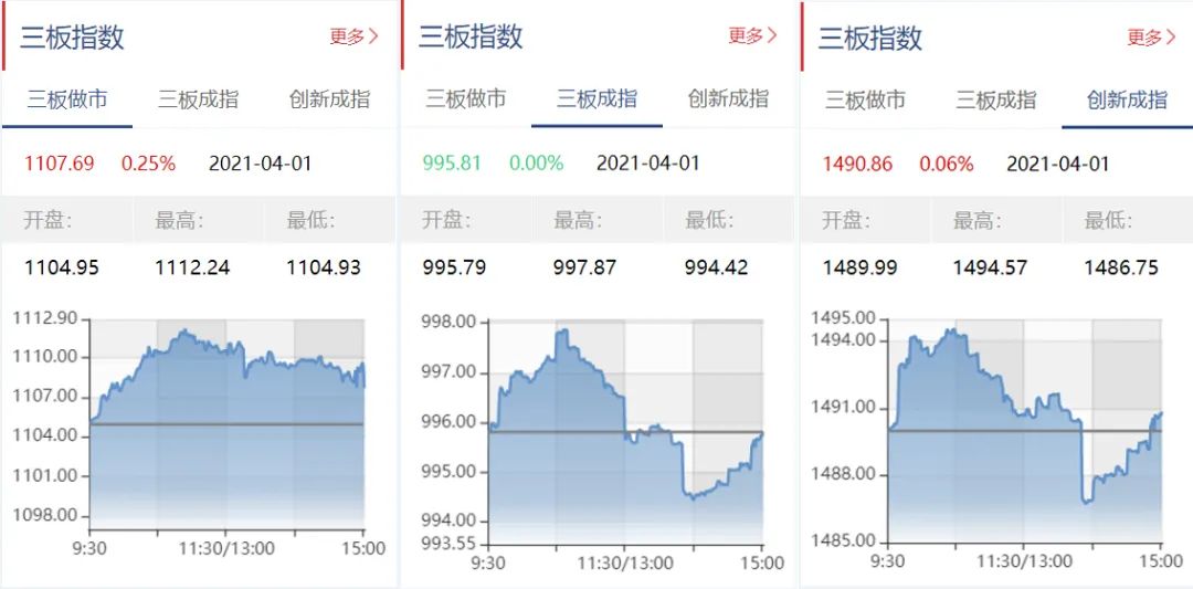 截至4月1日收盘,三板做市报1107.69点,上涨0.25%;三板成指报995.81点,上涨0.00%;三板创新成指报1490.86点,上涨0.06%。