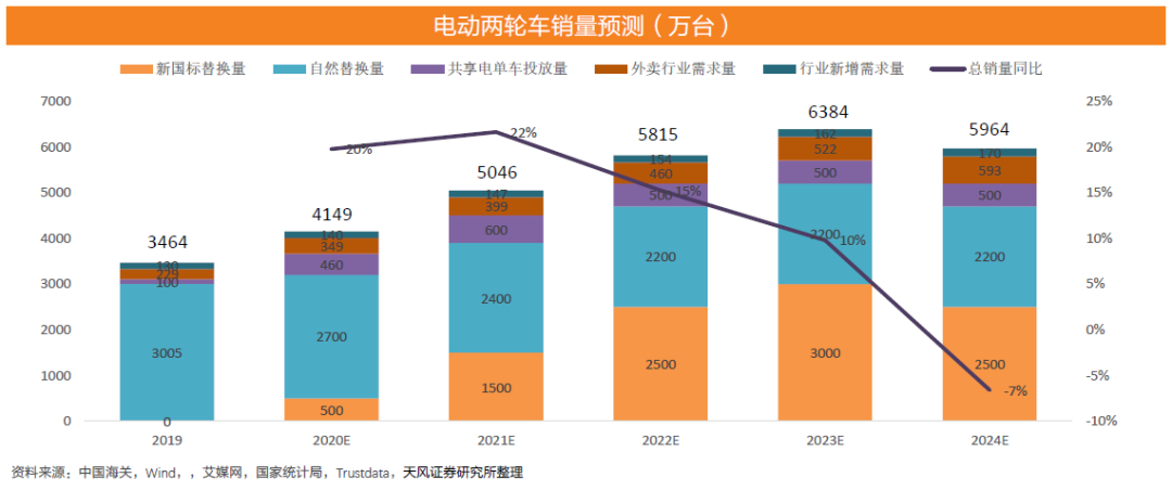 从各地已经公布的时间看,过渡期一般在2-3年,部分地区过渡期在4年,甚至5年,因此超标车的集中清退期在2021到2023年。对此,天风证券给出的市场预测为:2020-2024年5年间新国标驱动的电动两轮车增量为500、1500、2500、3000、2500万辆,同比增速分别为19%、22%、15%、10%、-7%。