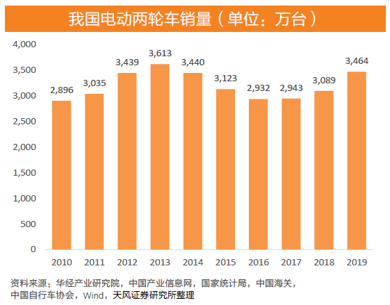 相关报告显示,2019年及以前全国电瓶车的保有量超过3亿辆,中国市场的年产量超过3500万辆,在两轮车市场销售占比超过50%。同期摩托车、自行车销量分别约为1000万辆、1253万辆。