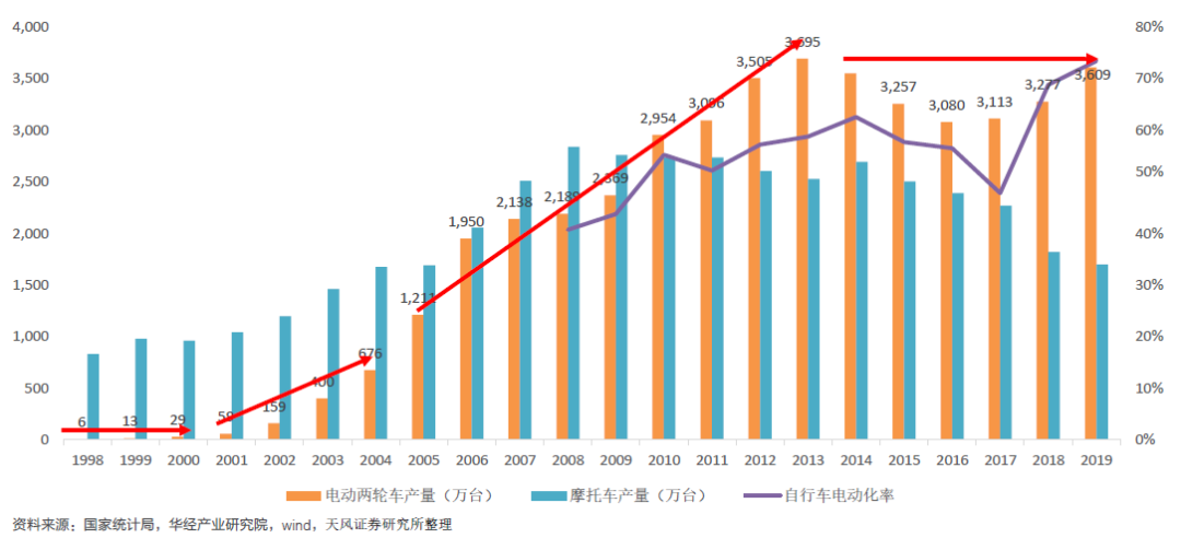 中国的两轮车出行方式,有着非常明显的进化特征,即自行车→摩托车→电动两轮车,尤其是摩托车的引入,在城镇化率还比较低的发展时期,迅速成为全国性的出行工具。1994年,中国以522万辆的成绩,成为世界第一大摩托车产销国,20世纪后期,是摩托车高速发展时期,摩托车的市场渗透率得到了持续提升。