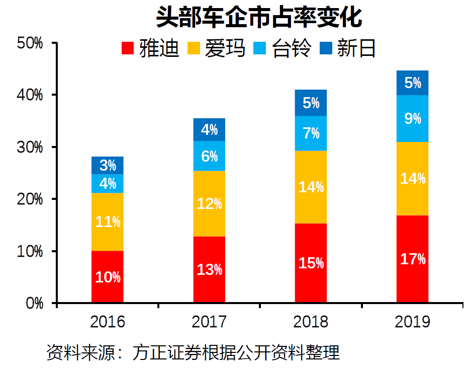 2016年,电瓶车市场的四家头部厂商雅迪、爱玛、台铃及新日的综合市场占有率才28%,到2019年也才45%。即便加上第五的小刀,前五的市场占有率也不到50%。