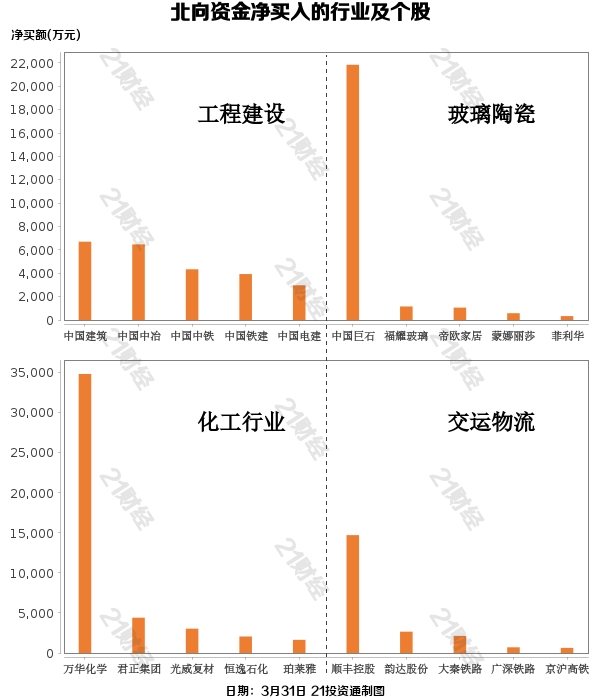 从净买入金额来看,北向资金增持了22个行业,其中工程建设居首,净买入金额达2.57亿元,其次是玻璃陶瓷行业,净买入1.76亿元。