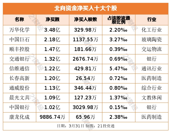 个股方面,北向资金净买入万华化学(600309.SH)、中国巨石(600176.SH)、顺丰控股(002352.SZ)、交通银行(601328.SH)、信维通信(300136.SZ)居前,其中,万华化学被净买入3.48亿元,中国巨石被净买入2.18亿元,顺丰控股被净买入1.47亿元,交通银行被净买入1.32亿元,信维通信被净买入1.22亿元。