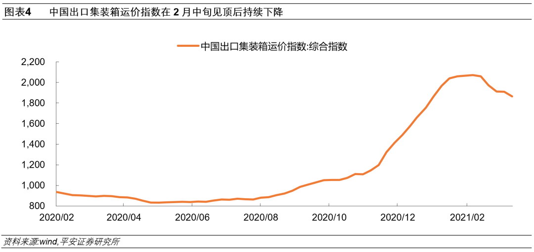 新出口订单指数强势,侧面说明了3月高频的出口集装箱运价指数走弱主因并非外需不足,中国出口目前仍保持高景气。去年8月开始,中国出口集装箱运价指数从860左右一路飙升,引起了很多讨论。终于在2月中旬到了顶点2072,此后各周持续下滑,3月第4周和高点相比已下跌了10.0%。3月官方PMI的两个新出口订单指数都很强势,意味着3月出口集装箱运价下跌,主要原因不是外需减弱,而主要在于:国际航运更加畅通,船东的运费要求有所下降;加之前期运价大涨也挤压外贸企业的利润,运价本身也有回调压力。随着以美国为代表的全球需求进一步复苏,以及非发达市场疫苗接种相对较缓,我们预计上半年中国出口仍可保持高景气。