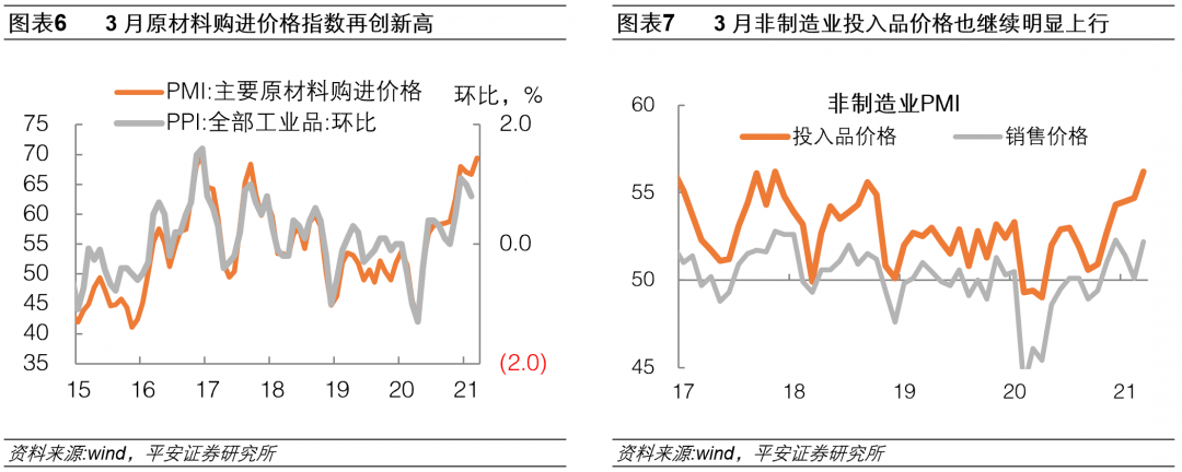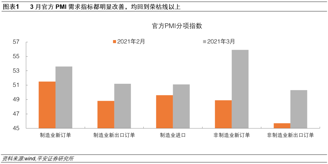 第一,需求扩张回到去年四季度水平,出口对经济的带动作用仍然显著,建筑业订单快速增长或预示基建投资改善。新出口订单指数强势,侧面说明了3月高频的出口集装箱运价指数走弱主因并非外需不足,中国出口目前仍保持高景气。随着以美国为代表的全球需求进一步复苏,以及非发达市场疫苗接种相对较缓,我们预计上半年中国出口仍可保持高景气。