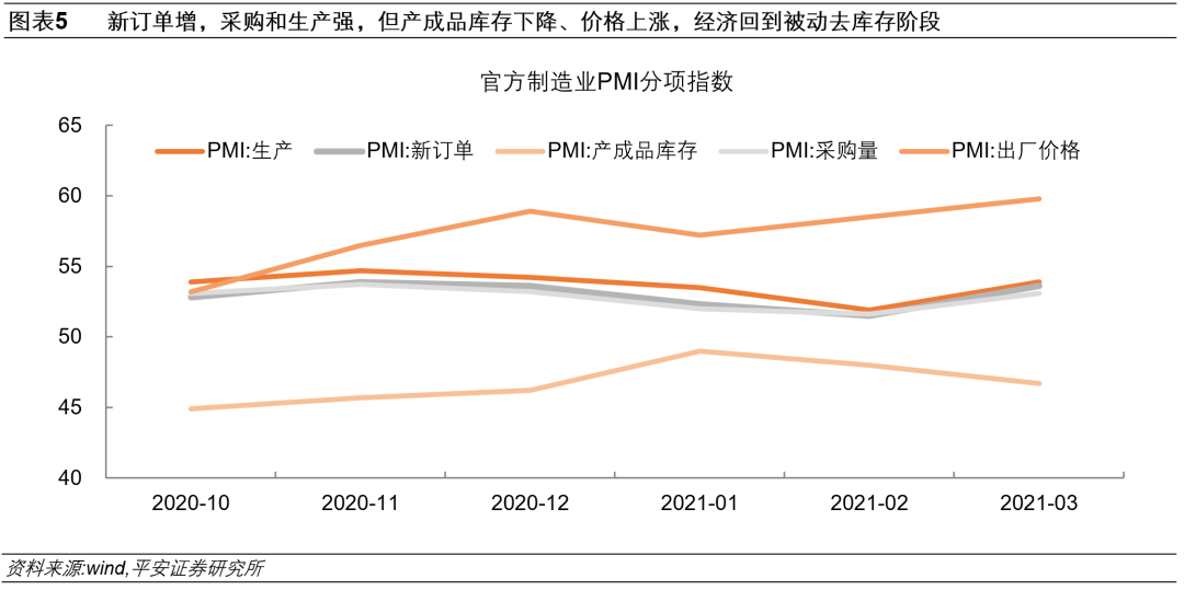 第二,需求恢复带动生产走强,经济回到被动去库存。3月制造业企业新订单增,采购和生产强,但产成品库存下降、价格上涨,经济回到被动去库存阶段。从业人员指数从48.1回升到50.1,时隔10个月再度回到荣枯线以上,就业形势向好。