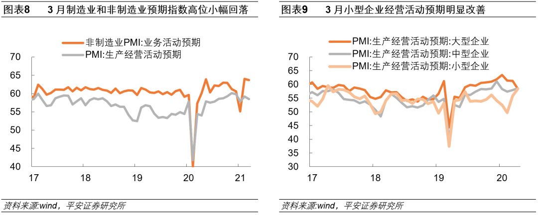 第三,价格指标继续走高,企业经营预期小幅回落。分行业看,涨价压力大的主要集中在上游,且3月通用设备和专用设备的原材料购进价格指数也都高于70。如果上游继续涨价或者持续位于高位,有可能将压制相关行业的生产和资本开支。3月制造业和非制造业的业务活动预期指数均从高位出现小幅回落,可能就与原材料价格上涨压力加大有关。