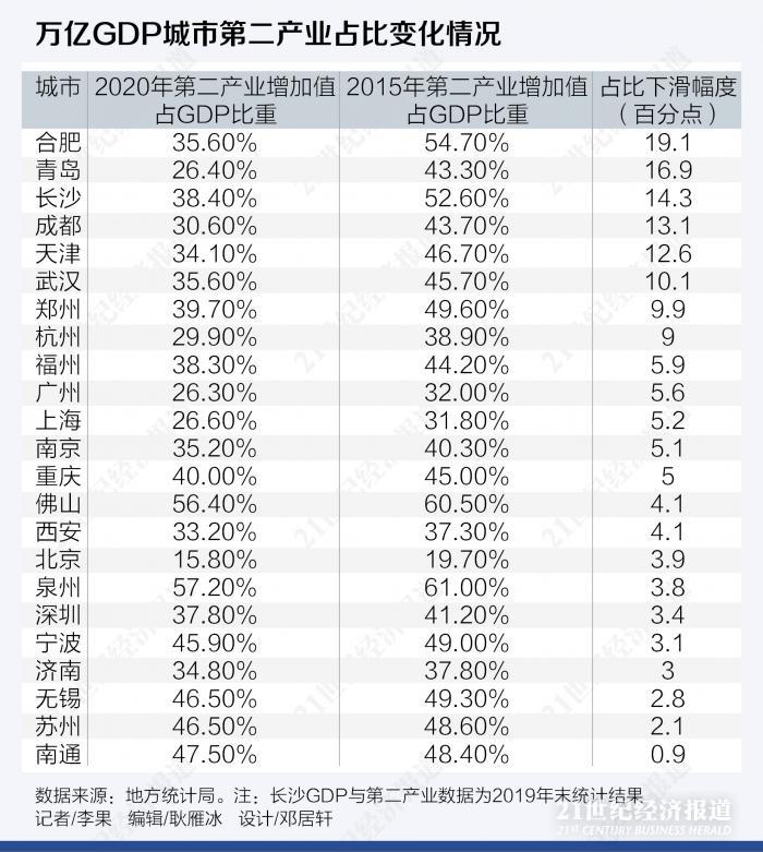 但2020年末,23座城市第二产业增加值的平均占比下降到37.31%。占GDP比重超40%的城市减少到7座,仅泉州和佛山的制造业依然占据“半壁江山”。