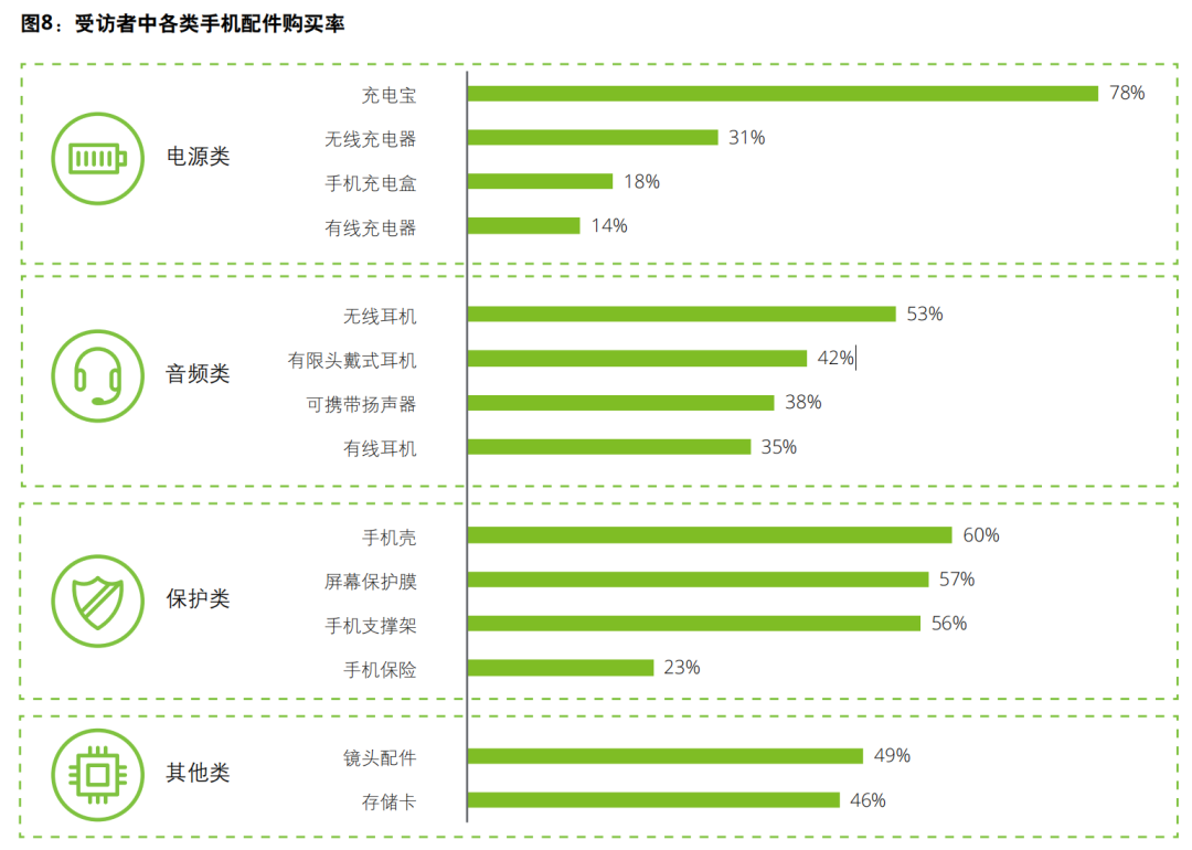 德勤一份消费者调研报告指出,25-34岁的年轻人群是购买各类手机配件的主力军。在各类手机配件中,购买意愿最强的是充电宝,购买率近八成(78%),其次为手机壳(60%)、屏幕保护膜(57%)以及手机支架(56%)。其中,充电宝及手机保护类配件是最热门手机配件。