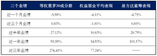 现在我们回过头来看看茅20的成色怎么样,以最新的成分股进行回测,如果等权重买入这20只成分股,在近一月、近半年、近三年的收益率会有多少?我们不妨拿茅20与公募权益基金的平均表现进行一下对比: