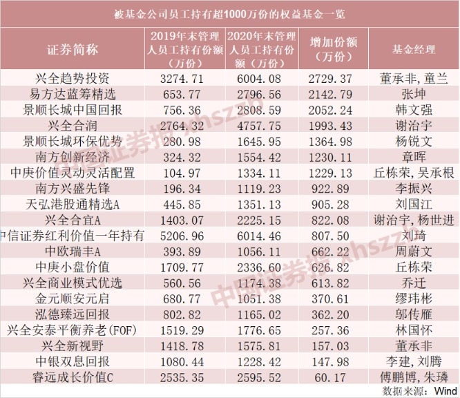 中证君梳理了2020年年报披露基金公司员工买入超1000万份的权益基金,剔除在2020年出现员工持有份额缩减的基金后,以下20只基金权益基金最“受宠”: