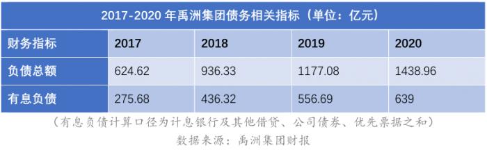 四处拿地盖房需要“弹药”支持。2018 年禹洲集团开始加杠杆,债务规模快速膨胀,当年负债总额大增50%。截至2020年末,禹洲集团负债总额达1438.96亿,相比2017年的负债总额624.62亿,猛增1.3倍。从更能反映偿债压力的有息负债规模来看,年报显示,2020年末禹洲集团有息负债(包括计息银行及其他借贷、公司债券、优先票据)规模达到639亿,其中一年内到期的债务规模达188.84亿。