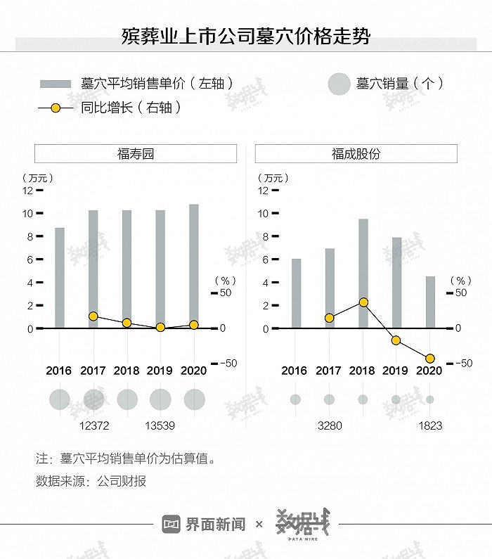 其中,2020年福寿园经营性墓穴平均销售单价约10.77万元,价格涨幅达5%,连续4年上涨。由于收购“爆雷”对殡葬业务营收产生较大影响,界面数据选取福成股份2018年财报进行分析。2018年,福成股份墓穴平均销售单价为9.49万元,价格涨幅达36.9%,连续2年上涨。