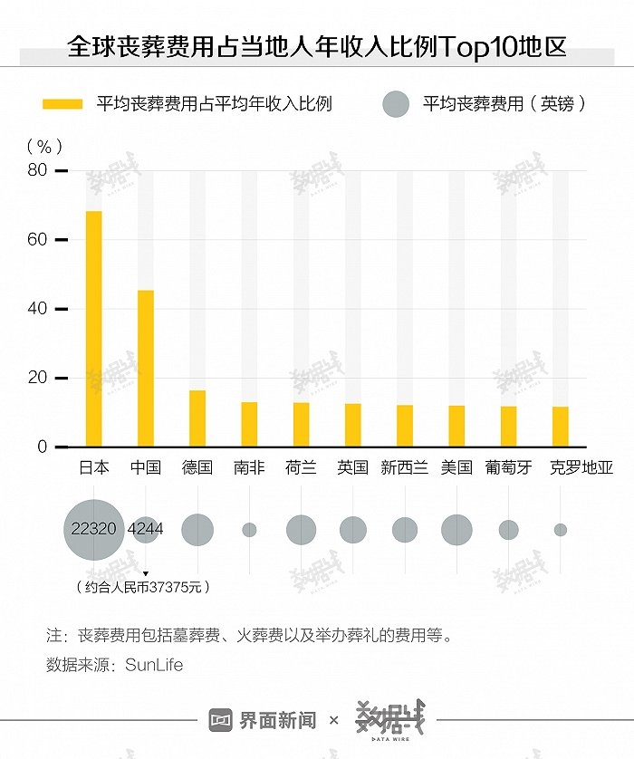 从全球来看,中国人丧葬费用占年收入比例排在世界第二。人寿保险机构SunLife的一份全球丧葬费用调查报告显示,中国平均丧葬费用约37375元,约占年平均工资的45.4%,占比排名世界第二。排名第一的日本丧葬费用占年平均工资的比例为68.3%。其余国家或地区丧葬费用占年平均工资的比例均不足20%。
