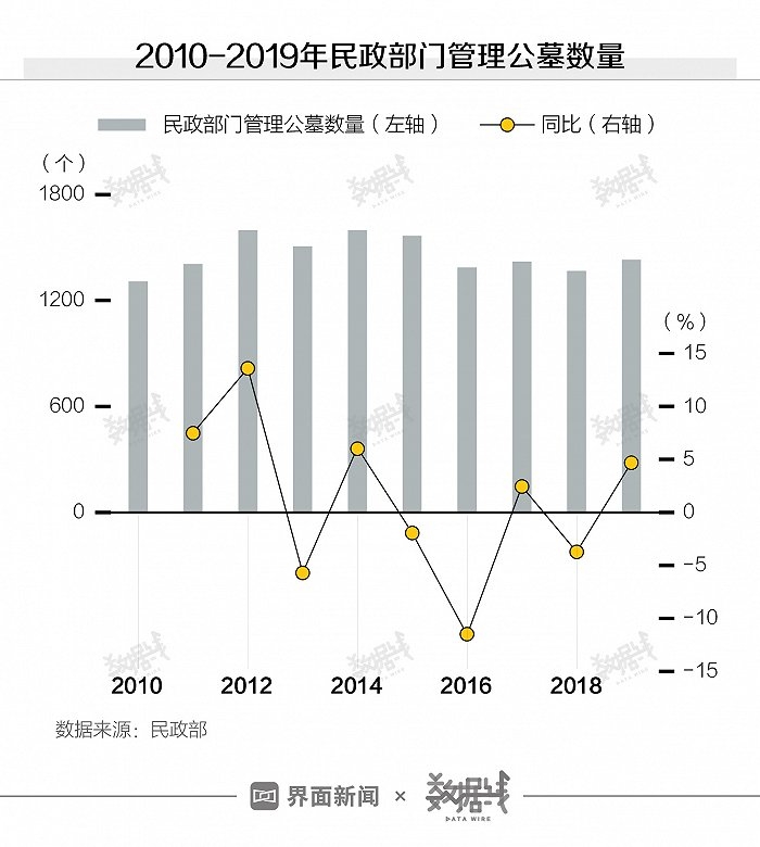 从墓地供应上来看,近年墓地供应量小幅提升,但增长不多。据民政部数据,截至2019年,民政部门管理公墓数量为1431个,同比增加4.7%。未来一段时间内,墓地需求依然“紧俏”。