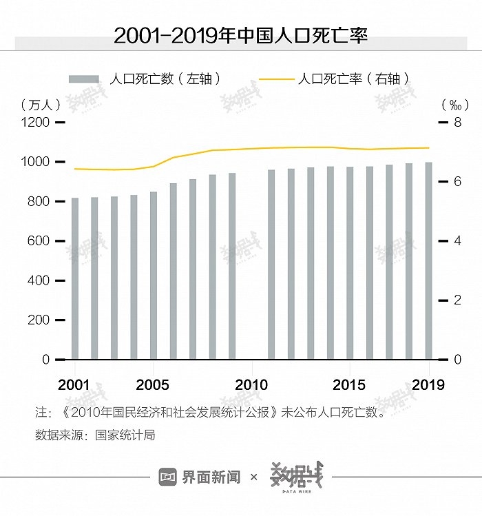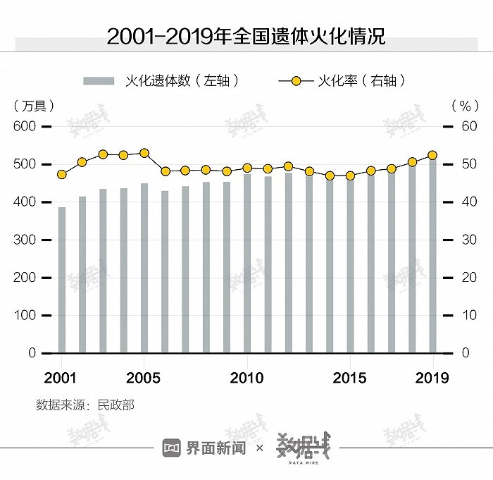 据国家统计局,中国人口老龄化程度逐渐加深。截至2019年,中国65岁及以上人口达1.76亿,占总人口比例为12.6%。与2001年相比增加了0.85亿人,占比上升了5.5个百分点。同时,2001年至2019年,中国人口死亡数及死亡率逐年上升,遗体火化率也在逐步提高。这意味着,未来对墓地的需求还会更大。