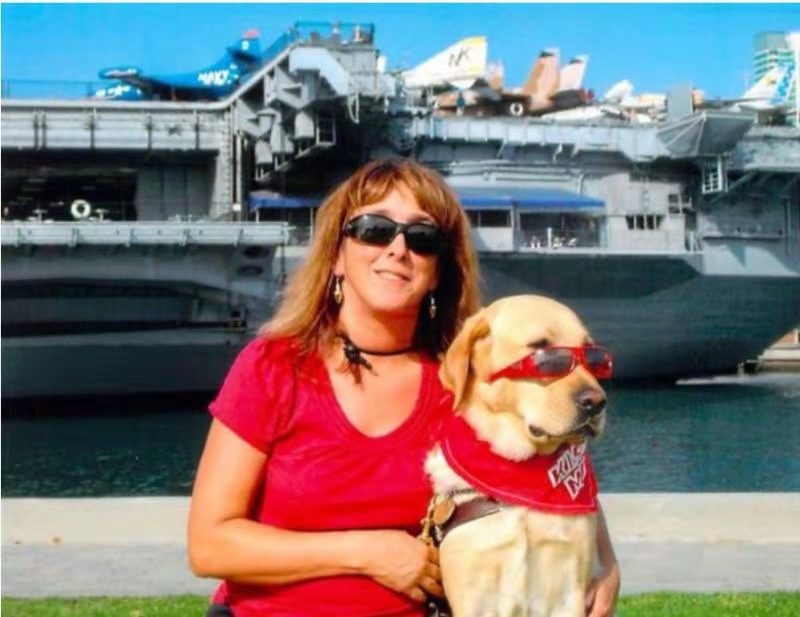 图为美国盲人女性丽莎·欧文和她的导盲犬
