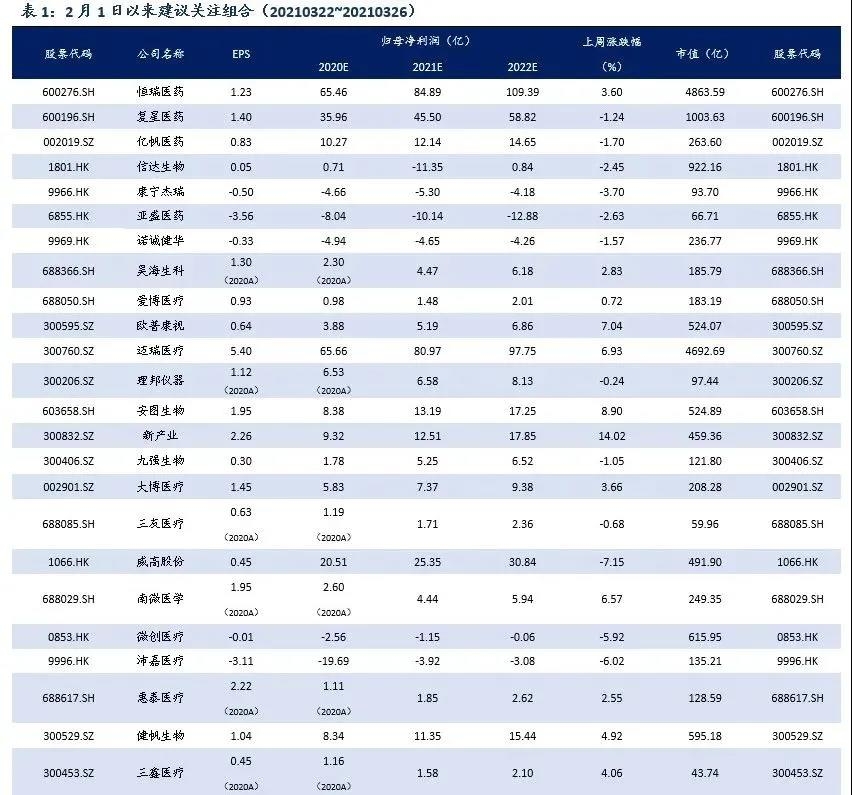 为何近期医疗服务、医美标的股价反弹涨幅较大?很可能因为一季度业绩超预期是主因,2020年一季度医疗服务、医美基本全面歇业,影响较大;预期2021年一季度医疗服务、医美全面恢复,快速增长。本周医药板块算术平均指数涨幅明显小于总市值加权平均指数,说明大市值个股见底迹象明显。