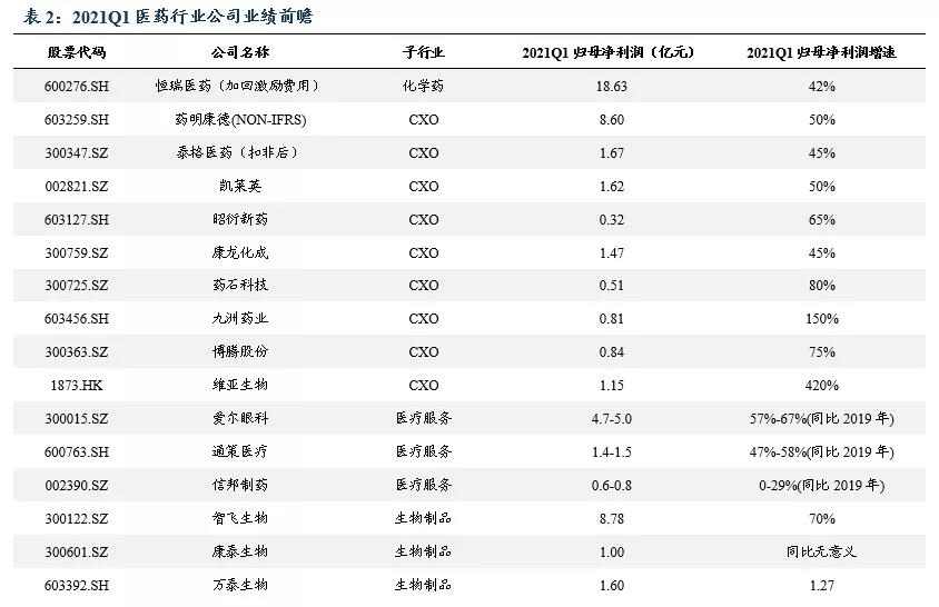 整体来看,2020年一季度医药行业受疫情影响较大,但随着疫情从2020年下半年逐步得到控制,我们预计2021年一季度许多医药细分板块业绩将出现显著反弹,如医疗服务、医美、CXO、生长激素等细分赛道一季度业绩增速有望达到较高水平。