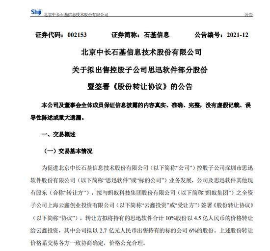 4月5日晚间,石基信息发布公告,控股子公司深圳市思迅软件股份有限公司(以下简称“思迅软件”)拟引入蚂蚁科技集团股份有限公司下属全资子公司上海云鑫创业投资有限公司(以下简称“云鑫创投”)为战略投资者,后者将以4.5亿元受让思迅软件现有股东10%股权,其中石基信息出售的股权比例为6%,作价2.7亿元。