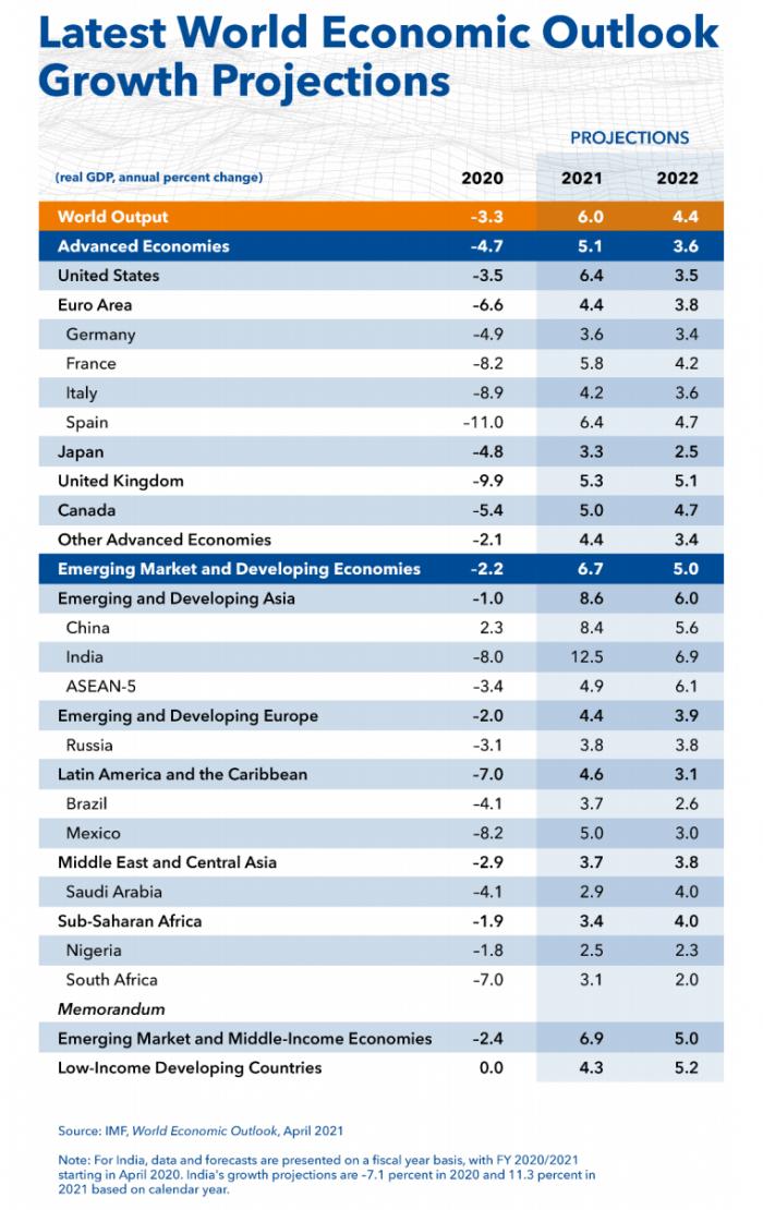 4月6日,国际货币基金组织(IMF)发布最新一期《世界经济展望》,预测2021年、2022年全球经济将分别增长6.0%和4.4%,比该组织1月的预测分别调高了0.5个百分点和0.2个百分点。