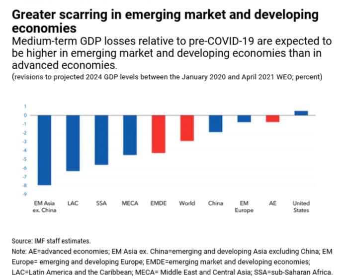 她说,虽然各国政府迅速采取的政策行动避免了更为糟糕的结果,预计2024年的全球GDP相比疫情前的预测值将下降约3%,这比2008年全球金融危机的影响要小。但她指出,与当时不同的是,“由于政策空间有限,预计新兴市场和低收入国家将留下更大的伤疤”。