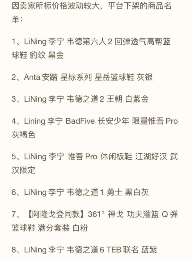2、经核查,此次网传图中涉及的三款球鞋,即李宁韦德之道4全明星银白款、李宁韦德之道 7wow 7 The Moment 超越限量款粉色款和安踏哆啦A梦联名休闲板鞋白黑款,这三款球鞋的价格均为平台卖家个人所设定,且在卖家设定的价格下并无买家成交或极少有买家成交。目前,针对这三款中卖家所标价格波动过大的球鞋,已进行下架处理。