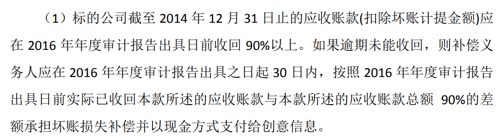 如上文所述,创意信息曾约定格蒂电力2015至2017年各期新增应收账款要两年内回收90%以上,若逾期未能完成回收,则原股东现金补偿差额部分的90%。