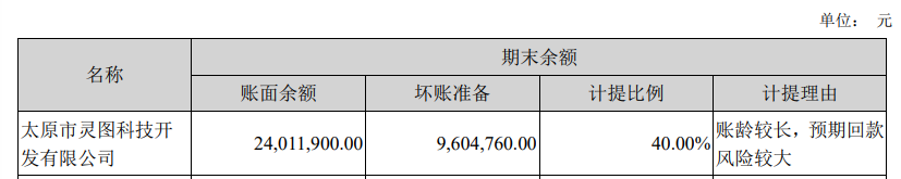 创意信息2019年年报显示,按单项计提坏账准备的列表首次出现了太原市灵图科技开发有限公司(简称“灵图科技”),对灵图科技应收账款坏账计提比例为40%。