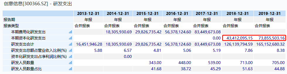 2017年以前,创意信息的研发费用全部确认为当期费用,2018年公司确认资本化研发支出4341万元,2019年公司确认资本化研发支出7386万元,其中,2019年资本化研发支出占当期净利润的63%。