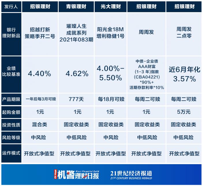 【机警点评】招银理财“招越打新策略季开二号”业绩比较基准(年化)为4.4%,锁定一年后每三月开放。该产品固定收益类资产投资比例0%-80%(其中高流动性资产不低于5%),权益类资产0%-80%,商品及金融衍生品0%-80%。从投资范围来看,权益类资产包括但不限于境内上市股票(包含主板、中小板、创业板、科创板、存托凭证及其他依法发行上市的股票,可参与打新、配股、融资融券等投资,不含新三板); 内地与香港股票市场交易互联互通机制下允许买卖的香港联合交易所上市股票 (港股通标的股票)等。商品及衍生品类资产包括但不限于股指期货、场内期权、场外期权、收益互换等。
