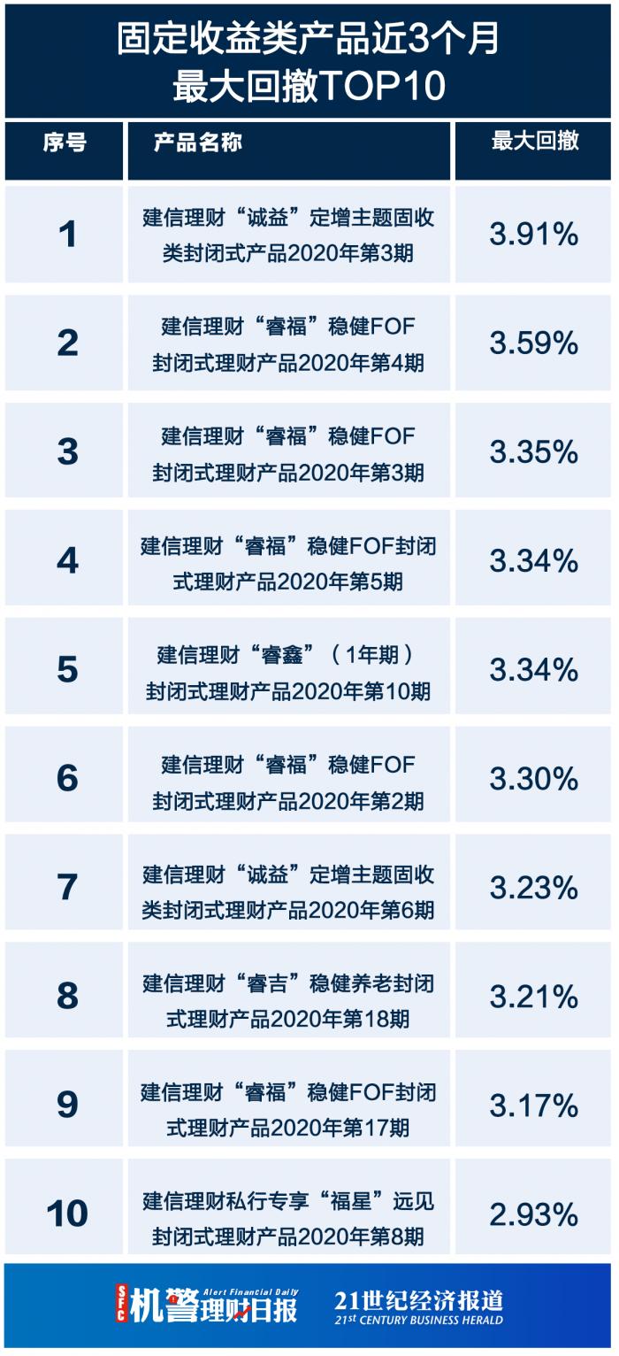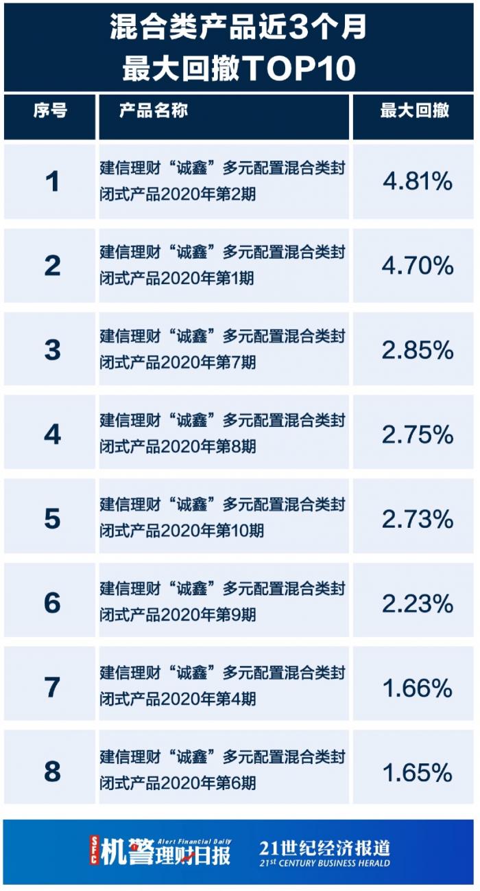 根据南财理财通数据,在理财子公司已发产品中,近3个月混合类产品最大回撤排行榜中,最大回撤最高的前10位产品包括建信理财的“创新”系列以及建信理财“诚鑫”多元配置系列。榜单前十名产品均出自建信理财,其中“诚鑫”系列产品占据8个席位。最大回撤最高的建信理财“诚鑫”多元配置混合类封闭式产品2020年第2期,最大回撤达4.81%。
