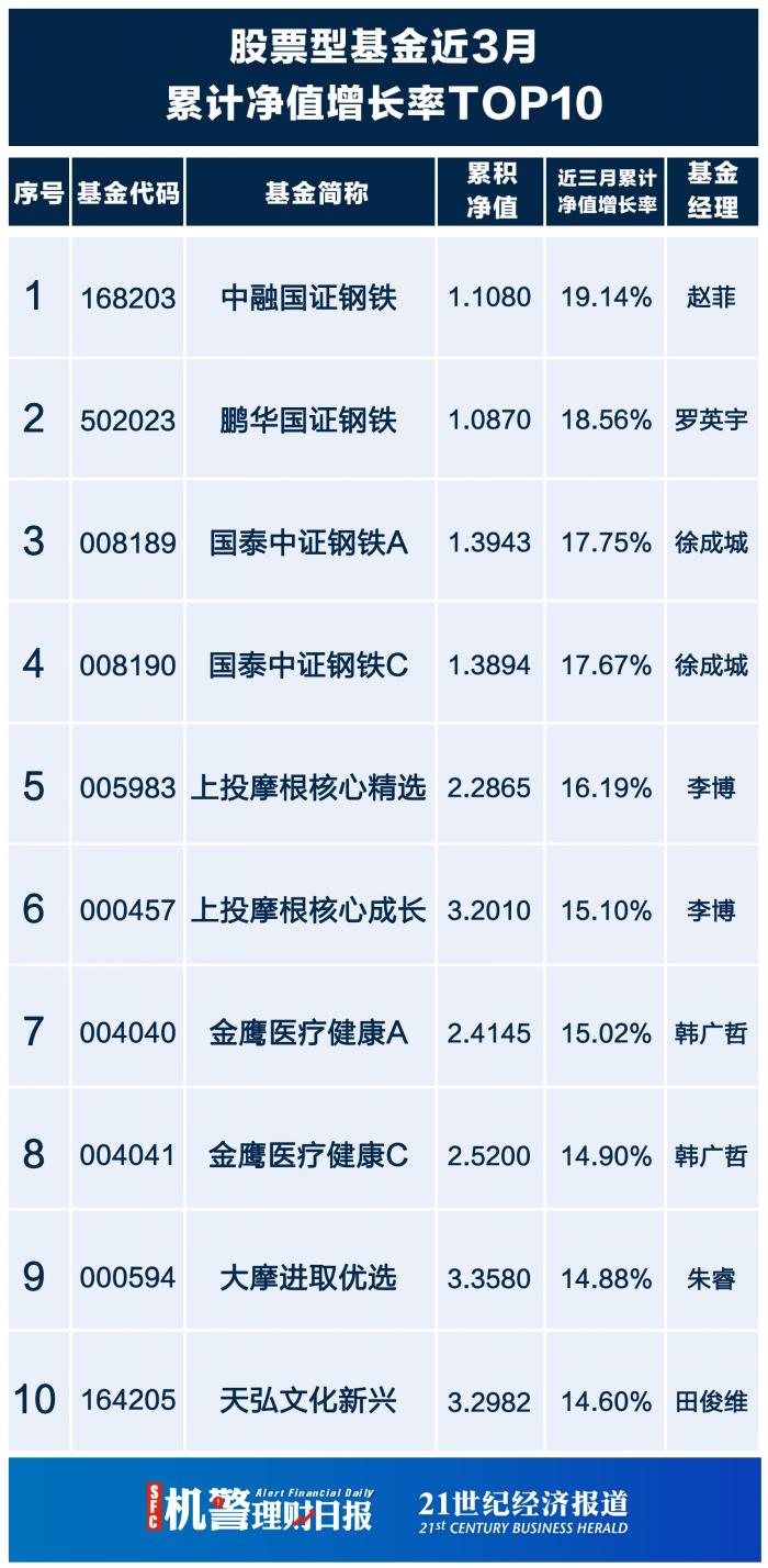 今日股票型基金榜单中,从近3月累计净值增长率来看,增长率最高的前10位产品包括中融国证钢铁行业指数、鹏华国证钢铁行业指数、国泰中证钢铁ETF联接A等。其中,大摩进取优选股票于前10位中累计净值最高,为3.3580;持仓方面,其股票仓位百分比达95.00%,持仓占比前三为桐昆股份、玲珑轮胎、恒力石化;评级方面,济安金信评级3星,招商证券评级1星,上海证券评级2星。