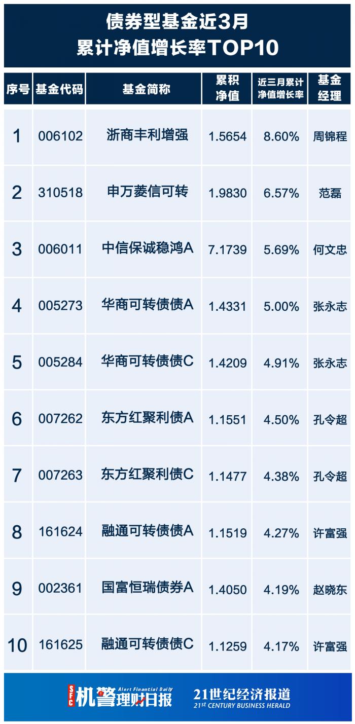 今日债券型基金榜单中,从近3月累计净值增长率来看,增长率最高的前10位产品包括浙商丰利增强债券、申万菱信可转债债券、中信保诚稳鸿A等。其中,中信保诚稳鸿A于前10位中累计净值最高,为7.1739;持仓方面,其债券仓位百分比达76.19%,持仓占比前三为20进出04、20国开16、20进出09。
