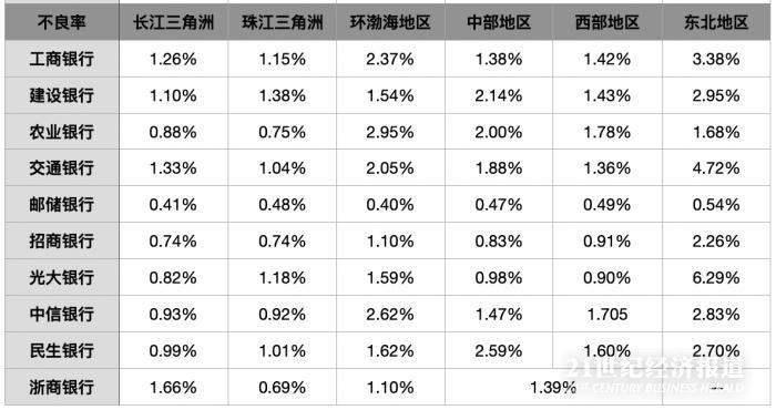 从利润贡献来看,上述11家银行在东北地区的利润占比均低于营收占比,且有2家银行利润为负;西部地区中有2家银行利润为负,中部地区中有1家银行利润为负;从不良率来看,绝大部分银行在东北地区的不良率最高,其次是环渤海地区或中部地区。