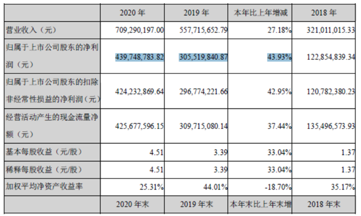 - 第四季度业绩增长加速。2020 年,爱美客实现营业收入 7.09 亿元,同比增长 27.18%,归属于上市公司股东的净利润4.40 亿元,同比增长 43.93%。第四季度归属于母公司股东的净利润同比增长率为75.24%。第四季度的增长明显加速了。