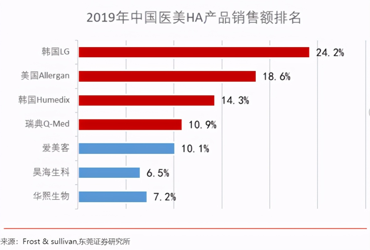 果然,2019年的数据,玻尿酸产品销售额排名前三名中有两名就是韩国公司,爱美客排在第五名的位置。