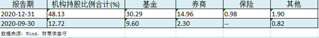 机构持股比例从三季度末的12.71%上升至四季度末的48.13%,机构抱团了半壁江山;其中,基金持股比例更从三季度末的9.6%暴增至30.29%,基金抱团可谓名副其实。