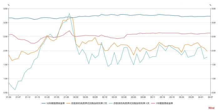 4月7日,1年期国债和10年期收益率分别为2.63%、3.23%,与前一日持平。整体来看,3月1年期国债和10年期收益率表现较为平稳。综合DR001和DR007的表现,货币市场资金价格变化较为平缓,资金面稳中偏松。
