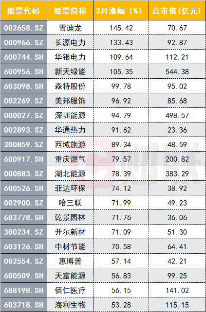 而这些个股的大涨与近期市场热炒题材碳中和密切相关,从上述图表中可以看出,3月份涨幅居前的个股中逾半数与碳中和概念有关,其中雪迪龙等涨幅翻倍的4股均具备碳中和概念。