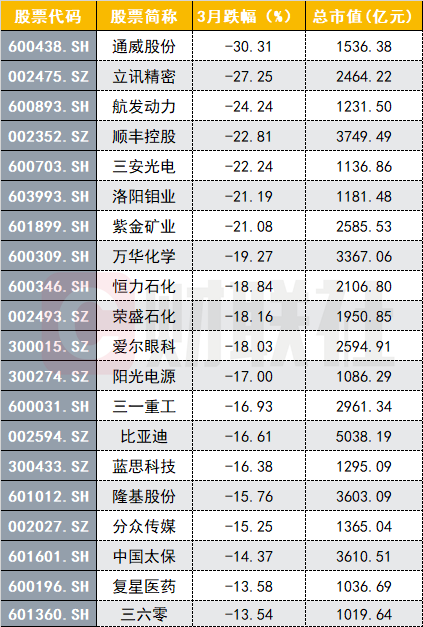 事实上,今年春节后遭遇大幅杀跌后,近期部分白马股虽然出现了一定的止跌迹象,但总体上仍然表现十分弱势。据财联社星矿数据统计,3月虽然指数下探后逐步趋稳,但不少抱团白马股跌幅仍然较大,其中通威股份、立讯精密、顺丰控股、三安光电等千亿市值白马股跌幅居超过20%。
