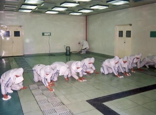 △1990年2月,为做好“亚洲一号”通信卫星进场准备,西昌卫星发射中心的科技人员对卫星测试场房进行擦拭,确保十万级洁净度。(西昌卫星发射中心提供)