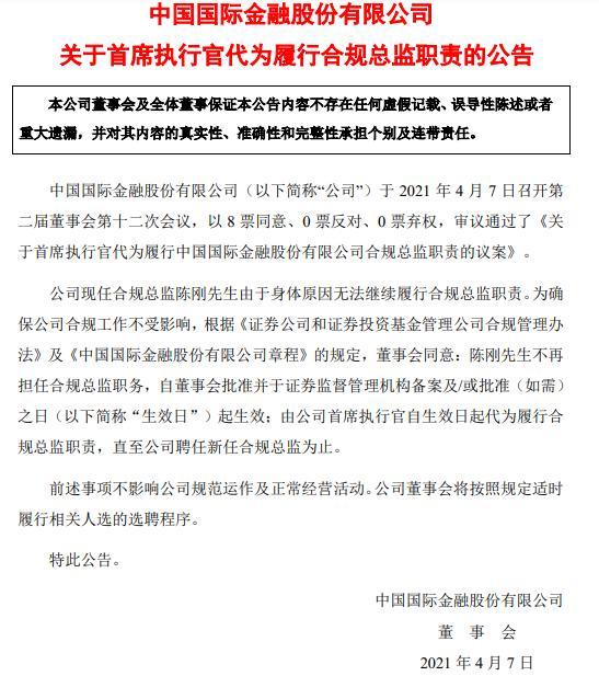 4月7日晚间,中金公司披露高管变更公告,公司现任合规总监陈刚由于身体原因无法继续履行合规总监职责。董事会同意陈刚不再担任合规总监职务,自董事会批准并于监管机构备案或核准日起生效。