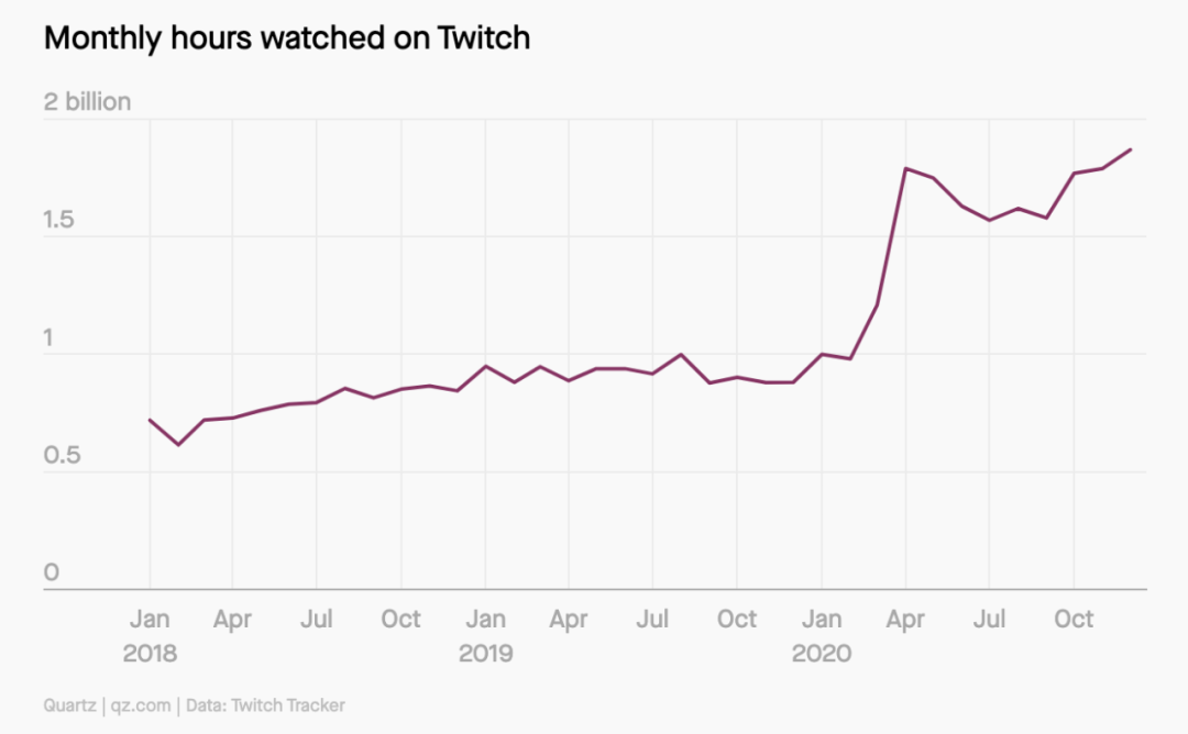 图为Twitch各月观看总时长统计 数据来源:Twitch Tracker