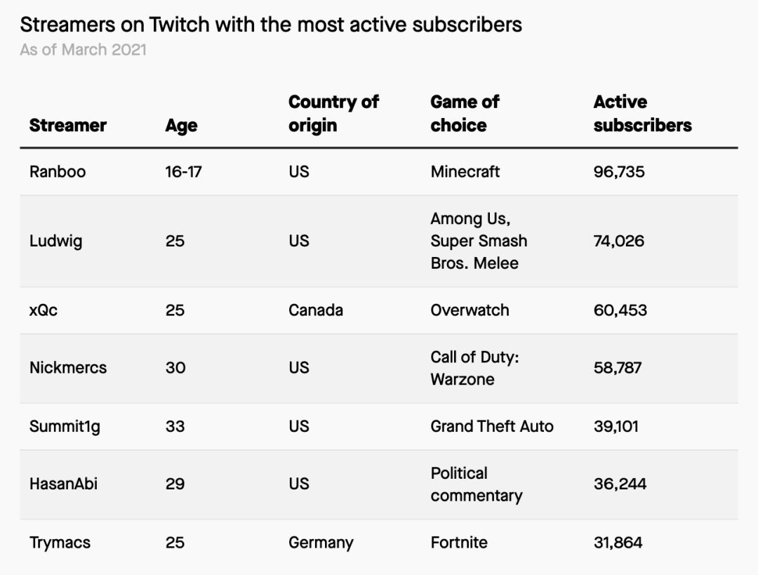 图为2021年3月Twitch上活跃粉丝数最多的主播 数据来源:Twitch Tracker