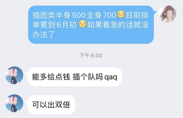 比如,上热搜的那个 13 岁女孩芙芙,一开始在米画师上找白琴约稿,但因为档期已满没能成功;最后,芙芙是微博私信联系上了白琴,并最终添加了白琴的 QQ 约了稿。