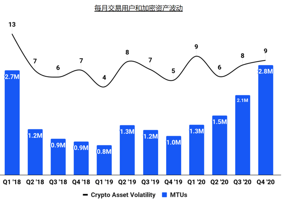 在这些交易用户里有普通散户投资者,机构投资者还有生态系统合作人员,截至2020年底拥有大约4300万个人投资者,7000个机构和115000个生态系统合作伙伴,在2019年到2020年这一年期间,机构投资者从大约4200增加到7000家,同比增长了67%以上。