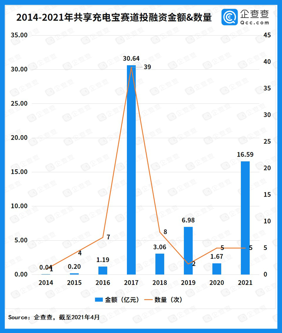 2014年以来,资本与赛道玩家带着复制共享单车的野心涌入共享充电宝领域。2017年达到资本最热的一年,全年共发生投融资39起,总金额超30.64亿元人民币,街电、小电和怪兽均在该年内完成三轮融资。随后几年中,资本热度有所下降,2018-2020年仅分别完成8次、2次、5次融资。2021年,共享充电宝再次回到资本视野,仅一季度就已经完成5次融资事件,融资总额为16.59亿元。